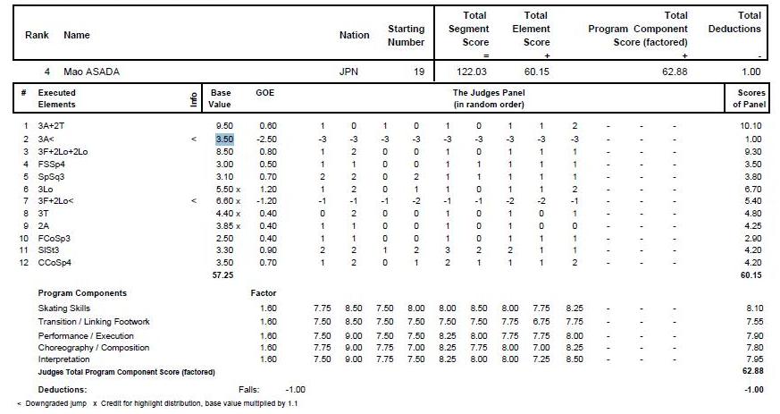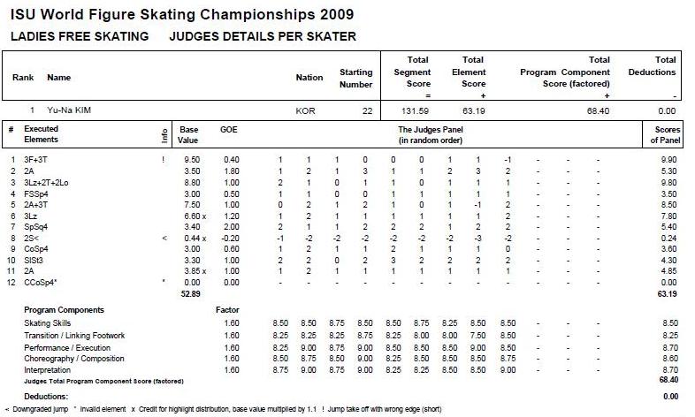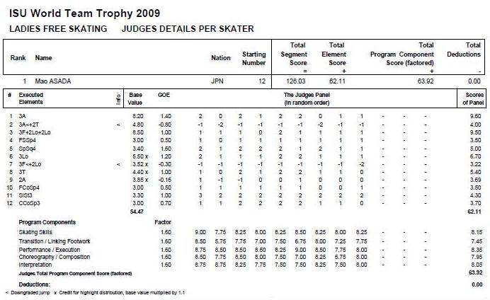 真央ちゃん、世界選手権のときはシングルの3アクセルが回転不足?基礎転3.5から-2.5点で1点しかもらえていません。でも、3アクセル-2トゥループは9.5で0.6点の加点。
